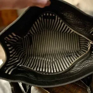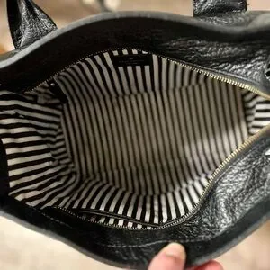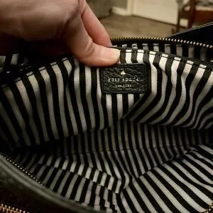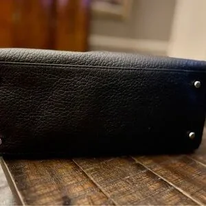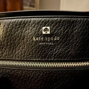 Beautiful and authentic Kate Spade, New York Hayes Street Pebbled Leather Tote in classic black. This is the large structured version with the signature tassel charm. Made from soft pebbled leather with gold-tone hardware,shoulder strap, and the iconic, black and cream stripe lining. In good preowned condition. Leather looks great with some minimal wear on the straps, zipper works smoothly. Interior has a small ink mark and some small staining. 13”W x 10”H x 9.5D 9.5 Handle drop.