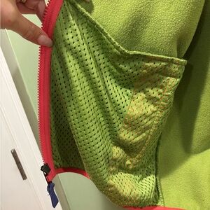 Stylish fleece jacket with olive, green and coral tones. Perfect for outdoor fun. Zip up pockets and pocket inside. Cozy cozy.