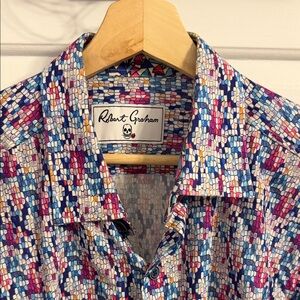 Vibrant button-down with intricate blue and red pattern. Perfect for casual outings. Signature Robert Graham style.