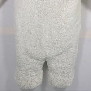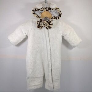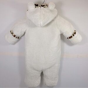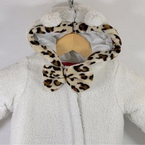 Weatherproof snowsuit/pram features high pile fleece and quilted lining that delivers warmth and comfort, cheetah hood trim & bow, attached hood, full front zipper, material is 100% polyester and turn back cuff mittens & booties that can be worn or folded away if not needed, color off white, size 12 Months Girls'. Snowsuit is gently used in very good condition.