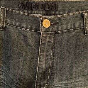 Men’s Mecca Denim Jeans Size W38 X L32 featuring a dark wash with natural fading design. Design with 5-pocket style, zip fly, and button closure.