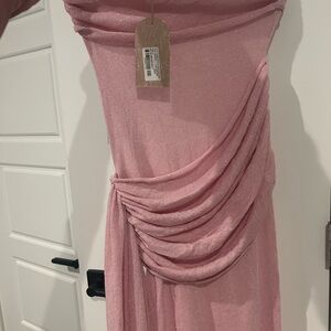 Chic strapless gown by Meshki. Features a soft pink hue. Elegant and stylish design.