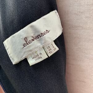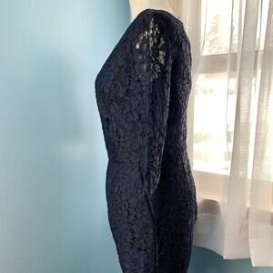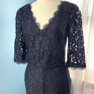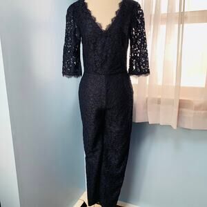 A beautiful navy lace jumpsuit with a dramatic v-neck and back that is a lovely option for parties, holidays and special occasions. Unlined lace 3/4 sleeves, hidden back zipper and it even has pockets! In excellent used condition