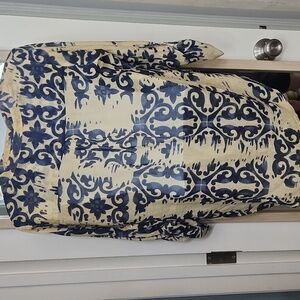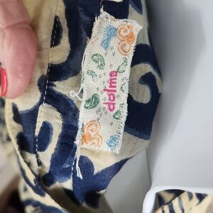 Stylish women's shear top featuring a navy and cream pattern. Perfect for any occasion. There are 2 pin holes at the button on the right sleeve. There is a photo of the flaw