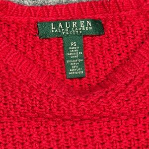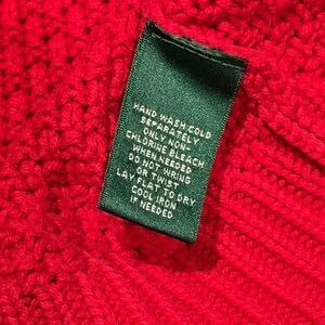 Vibrant red knit sweater. Crewneck design by Ralph Lauren. Perfect for cozy elegance.