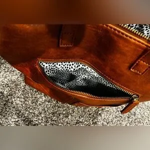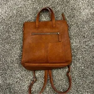 Stylish brown backpack with front pockets. Features a top handle and adjustable straps. Perfect for everyday use.