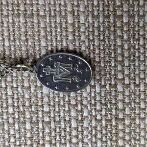 Petite two-sided medallion of the Madonna, the Virgin Mary, on long silver-tone chain. Neither medallion nor chain react to magnet.