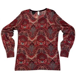 Gorgeous Talbots merino wool knit top featuring a rich paisley print in shades of red, burgundy, teal, and cream. Soft, lightweight, and perfect for fall and winter layering. Keyhole button detail at the neckline adds a feminine touch. Excellent condition.