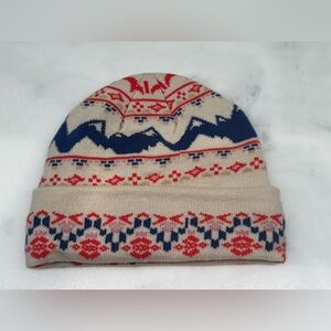 Stylish knit beanie with vibrant patterns. Features red and blue designs on a cream background. Perfect for adding flair to any outfit. Excellent condition. OS
