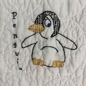 Discover a charming handcrafted quilt bursting with playful zoo animals, perfect for cuddling and decorating a little one's space. Each square showcases delightful embroidered creatures like a giraffe, zebra, snake, hippo, elephant, panda, lion, monkey, penguin, and seal, each accompanied by its name. The soft white fabric is gently quilted with a swirling pattern, creating a cozy texture that invites touch. This whimsical quilt is ideal for nursery decor, tummy time, or stroller rides, bringing the joy of the zoo to everyday moments.