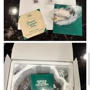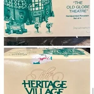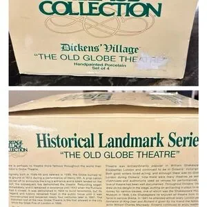 Charming miniature of The Globe Theater with intricate details. Department 56 vintage item. Features brown, gray, and green accents. Everything inside included. Looks to have never been used. Box has a few stickers on it and a wrinkling in one corner. See photos. Gorgeous piece.