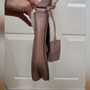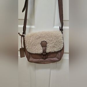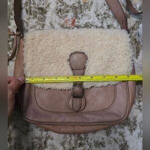 pls check last pic on the middle handle, like a minor crack. Stylish crossbody bag featuring a cozy shearling flap. Perfect for adding a touch of warmth to your outfit. The brown and cream colors make it versatile for any wardrobe.