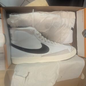 Step up your style with these Nike Blazers high-top sneakers. Featuring a sleek white and gray design, these shoes offer both comfort and fashion. Perfect for any casual outing. These shoes were only worn four times.