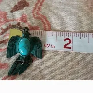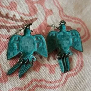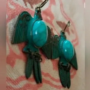 Boho faux turquoise bird earrings with intricate detailing. Fringe details. See last two pics gor measurements.