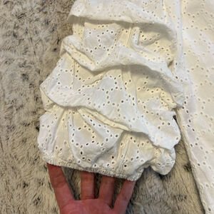 Elegant white eyelet top with puff sleeves. Perfect for a chic, casual look.