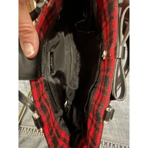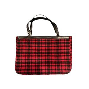 Design: Red and black plaid fabric exterior with black faux leather trim and bow detail on the front.