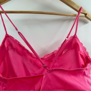 Gilly Hicks satin sleep tank top in a vibrant hot pink, size medium. Features delicate lace trimming along the neckline, crisscrossed back straps, and subtle side slits for added comfort and movement. Lightweight, silky, and perfect for lounging or sleepwear with a feminine touch.