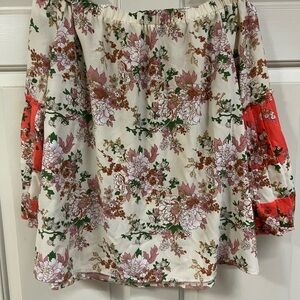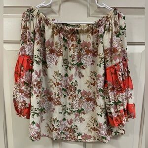 Chic floral blouse with off-shoulder design. Red and cream hues. Perfect for stylish outings.