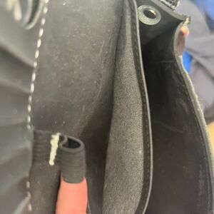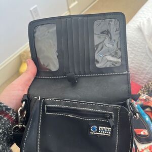 Little Earth Black Recycled Rubber Bottle Cap Closure Crossbody Purse Lucky Day Sasparilla bottle cap closure (snap) Inside has zippered pocket, card slot holder, two divided areas Key holder silver hardware made from recycled rubber Ava DeMarco and Rob Brandegee founded Little Earth Productions in 1993 with a simple goal: to create cool, well-designed products that made people smile. Although the product line has changed since then, Little Earth is still making people smile, with merchandise that is unique and fun. Excellent pre-owned condition Approx. measurements: Length: 6.5 inches, Height: 4 inches, Depth: 2 inches Little Earth black, recycled rubber, bottle cap closure, crossbody purse, eco-friendly bag, sustainable purse, black crossbody, recycled material bag, Little Earth purse, unique closure, bottle cap purse, eco-conscious accessory, trendy crossbody, black leather purse, upcycled bag, green fashion, Little Earth crossbody, innovative design purse, sustainable fashion, eco purse, casual crossbody bag, black eco-friendly purse.