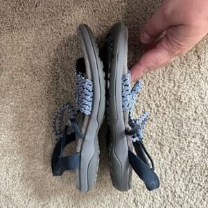 Skechers Reggae Slim Stretch Slingback Sandals in Light Blue & Gray in Women's Size 7. Shoes are in very good used condition with minor signs of wear. Memory foam inner soles. Please see close-up pictures for condition details. Hiking, outdoor wear, comfort shoes, walking, secure fit.