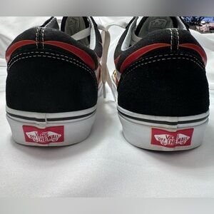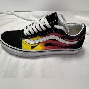 Bold Vans sneakers with striking flame design. Black base with yellow and red accents. Perfect for a standout look.