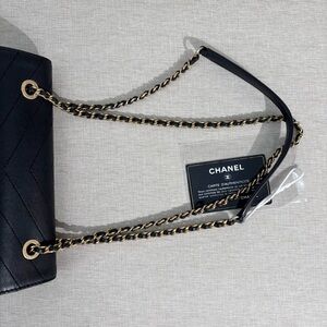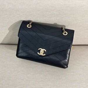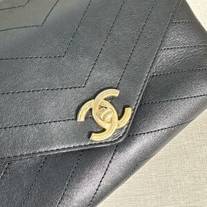 A stunning Chanel Chevron Flap in black Lambskin leather with gold hardware — elegant, structured, and timeless. The chevron pattern + Calfskin leather combo makes this piece incredibly elevated yet durable for everyday wear. This one has a naturally relaxed shape that adds a soft vintage charm while keeping an overall excellent presentation. The leather still has beautiful shine, and the chevron quilting gives it a modern, refined silhouette.