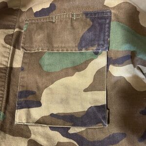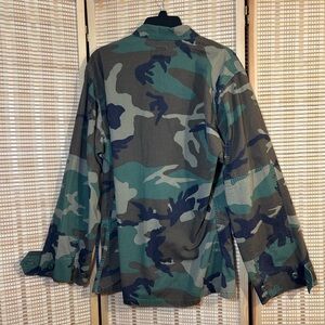 US Military Woodland Camouflage Battle Dress Uniform jacket. Appears possibly vintage. Likely from the 80s- 90s. In good, gently used condition, with some minimal wear. Approximate measurements laying flat are: