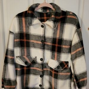 Cozy plaid teddy jacket. Features button-up front. Perfect for casual wear.