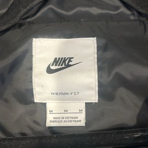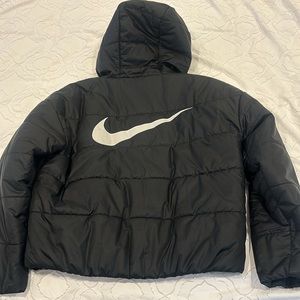 Stylish black puffer jacket by Nike. Features a hood and zip closure. Perfect for cold weather.