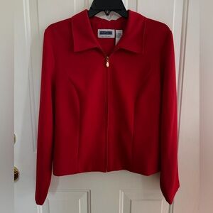 Elegant and lightweight red blazer by Prophecy by Sag Harbor. Features a pointed collar, front zip closure, long sleeves and a clean, structured silhouette. Unlined and perfect for office, church, workwear or layering.