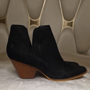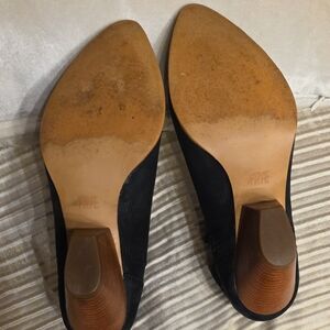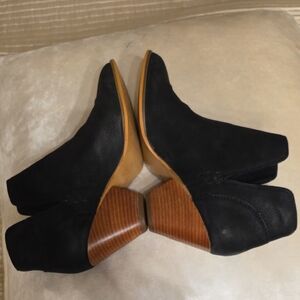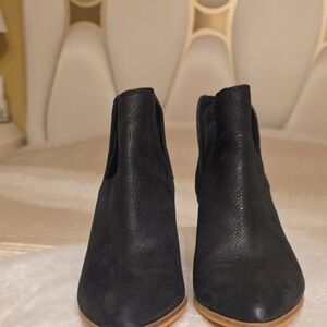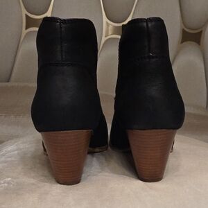 Chic black booties with a stylish wooden heel. Perfect for versatile wear. Easy to wear with the stylish cuts on both sides. Very comfortable to walk. Leather inside and outside. Beautiful pointed toe. 3 inches heels on the back. Very soft but tick leather.