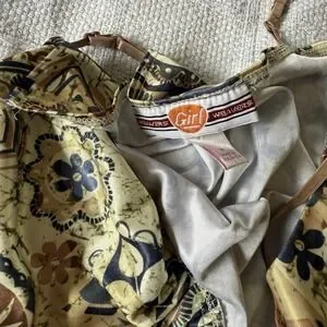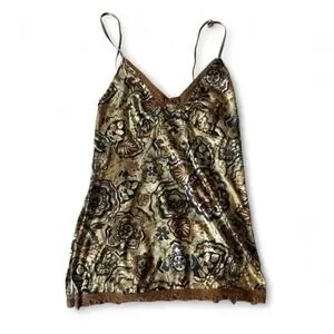 Vintage Weavers Girl camisole tank with a silky boho floral print in earthy tones of bronze, navy, and cream. Features adjustable spaghetti straps, lace trim neckline + hem, and a babydoll silhouette with a soft drape. A dreamy retro piece that fits right into Y2K, indie sleaze, and festival-inspired wardrobes.