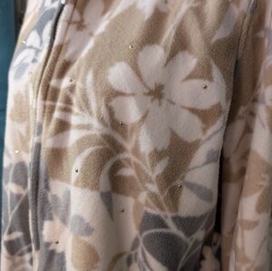 Soft and cozy Alfred Dunner fleece jacket with a neutral taupe/cream/gray floral design and scattered gold-tone studs for that subtle Y2K dazzle bling vibe. Lightweight but warm, with a relaxed easy fit and a classic zip-up front. Perfect for errands, cozy days, or anyone who loves that soft mcbling sparkle detail.