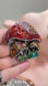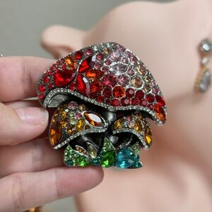 Whimsical mushroom brooch with sparkling crystals. Features red, orange, yellow, green, and blue hues. Perfect for adding charm to any outfit.
