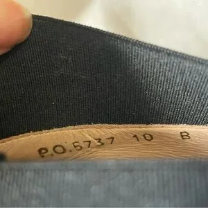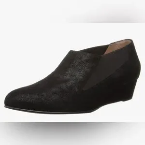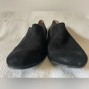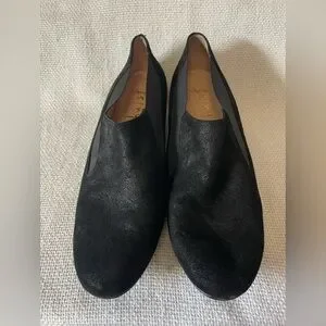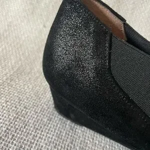 Step out in style with these elegant black slip-on shoes. Perfect for any occasion, they offer both comfort and sophistication. Elastic insets give the perfect fit. Soft suede. Soles show little use. There is a small mark on front left shoe