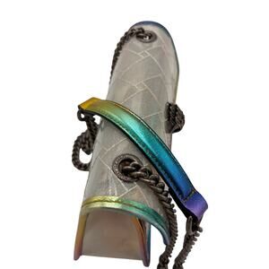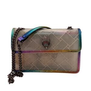 Add a bold pop of color to your wardrobe with the Kurt Geiger Kensington Medium Vinyl Crossbody. Crafted from glitter vinyl with quilted topstitching, this standout piece features the brand’s iconic eagle head emblem and vibrant rainbow gradient trim. Compact yet structured, it’s the perfect accessory for day-to-night wear.