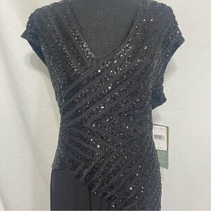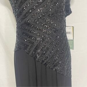 Shine in this elegant black evening dress featuring stunning sequin details. Asymmetrical waist designs gives a slimming line.