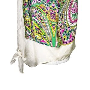 This vibrant floral print top features a stunning mix of green, pink, and cream colors. Perfect for adding a pop of color to your wardrobe.