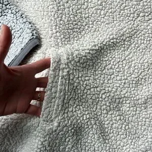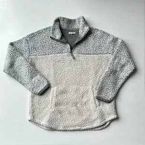 Stay warm and cozy with this stylish gray and cream sherpa. Perfect for layering in cooler weather. Zippered half zip closure and kangaroo pocket. Size small. Good used condition. Neutral colors.