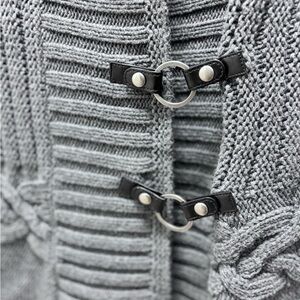Stylish gray knit cardigan. Features a unique toggle closure. Perfect for layering.
