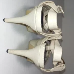 High heel stiletto sandals with intertwining straps, featuring a beveled platform, covered heel and adjustable ankle strap engraved with Saint Laurent Paris