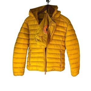 Save the Duck Lightweight Hooded Puffer. XL Flat Lay 25” L, 21.5”P-P. Mustard Yellow. Zip up, all the way up hood! Fitted Cut, pockets, elasticized wrists. Plumtech- synthetic down. Heat retaining, water repellant, breathable. Ecofriendly, sustainable. Packable- into its own bag. Magnificent. Runs small, please consider measurements. Excellent condition/like new.