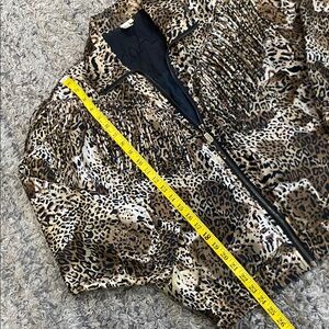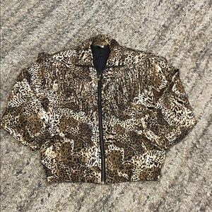 Chic bomber jacket with bold leopard print. Features a stylish zip-up front. Ideal for a statement look.