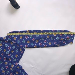 Beautiful vintage periwinkle purple (color is most accurate in second picture) dress with pink yellow & light blue / green abstract flowers and white polka dots. Cowl neck collar, puff shoulders a button bloused sleeves. Elastic cinched waist line which at its fullest stretch measures about 18” laying flat. Brand is Toni petite please see measurements for sizing 1960’s 1970’s 1980’s 1990’s retro mod vtg Has a Brandy Melville, free people anthropologie vibe to it
