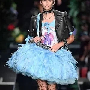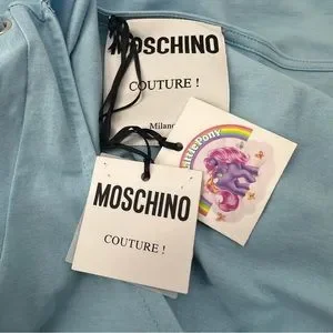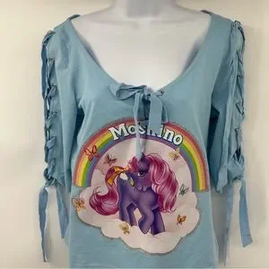 Moschino Couture | My Little Pony Ribbon Tee with Lace-up Sleeves | US 10. New with tags. Some scuffing to transfer (see photos) but doesn’t take away from the cuteness! Glitter detail. Worn by Kaia Gerber on the runway.