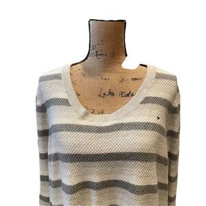 Keywords: Tommy Hilfiger, women's sweater, pullover, gray and white, striped, Plus size, crew neck, long sleeve, casual wear, knit sweater, regular fit, pre-owned.