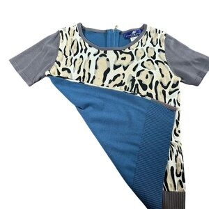 Juiceana colorblock leopard front sweater, wool/nylon, brown/blue Sz M/L