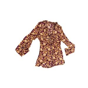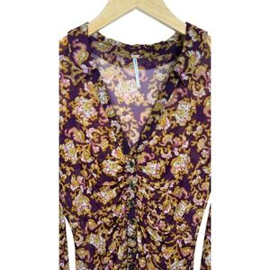 Keywords: Free People, floral print, ruched, v neck, long sleeve, button up, burgundy, gold, bohemian, feminine, romantic, everyday, dinner date, boho, hippie, retro, y2k