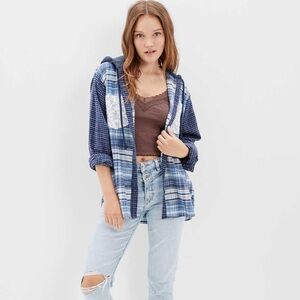 • American Eagle Oversized Mixed Media Hooded Flannel in Blue, Size Small