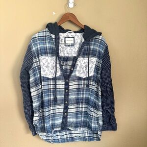 American Eagle Oversized Mixed Media Button Front Hooded Flannel Blue Size Small